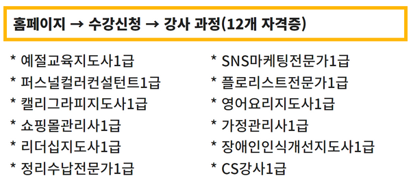 자격증양성과정은 우리 서울여성직업능력개발원 홈페이지에 가입을 하고 로그인을 한 후 수강신청란에서 관심 있는 과정을 선택하고 신청하기를 누르면 바로 오픈이 됩니다.