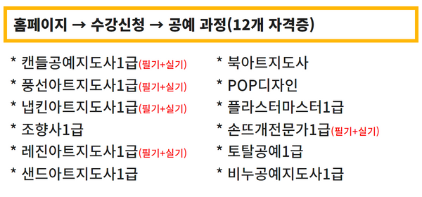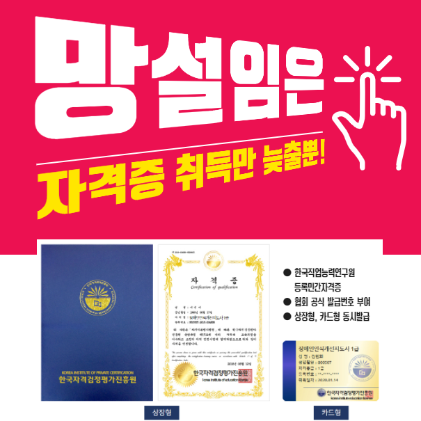 2급이나 3급 자격증이 없으신 분들도 1급 자격증으로 바로 취득을 할 수 있게 협회 규정이 되어 있고 취득한 자격증은 이력서에도 기재를 할 수 있는 과정입니다.