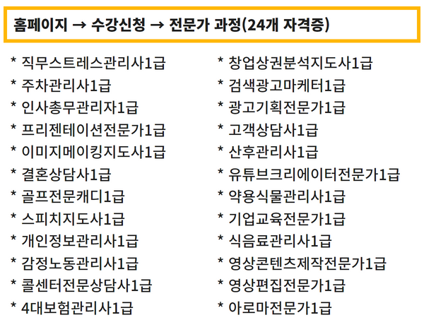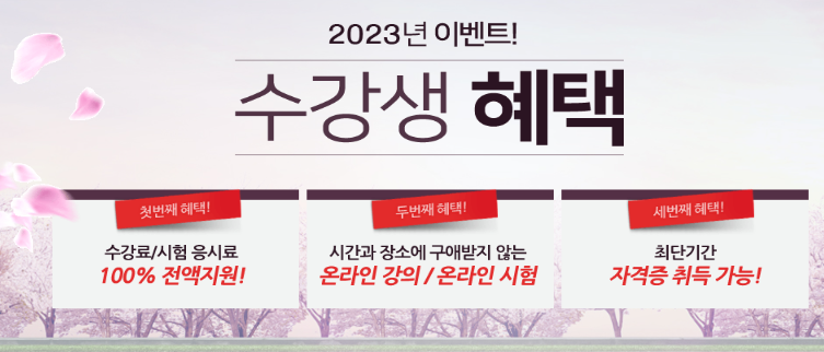 강의는 24시간 오픈이 되어 있기 때문에 수강하고 싶은 시간대에 수강을 들을 수 있고 자격증시험은 온라인 출석률 60% 이상되면 개별적으로 응시가 가능합니다.